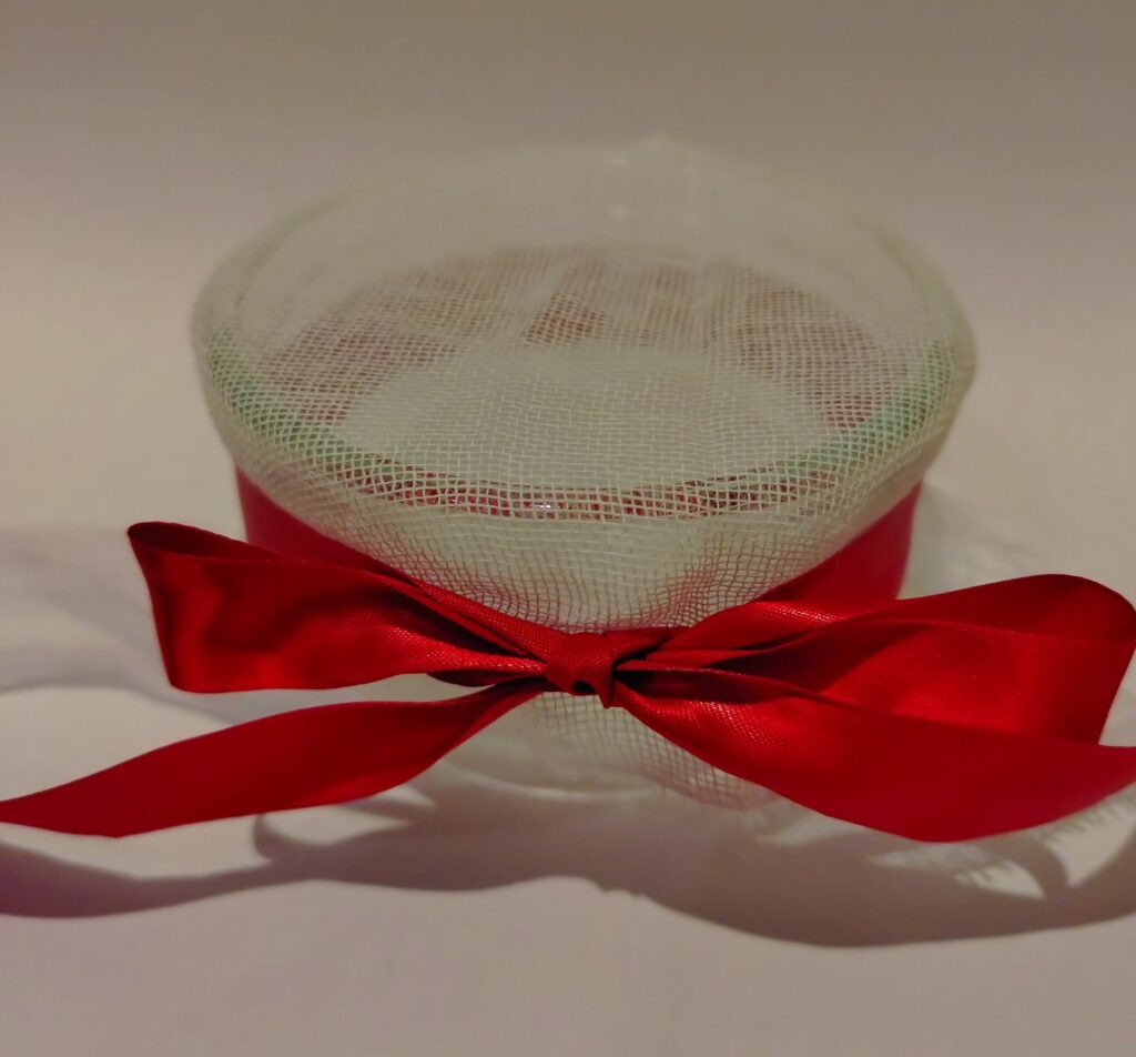 ④ガーゼとリボンを用意し、容器に蓋をしてリボン等で結ぶとちょっと華やかに見えます。